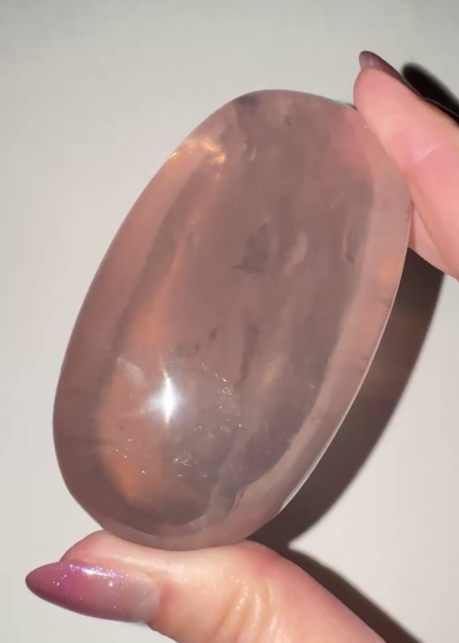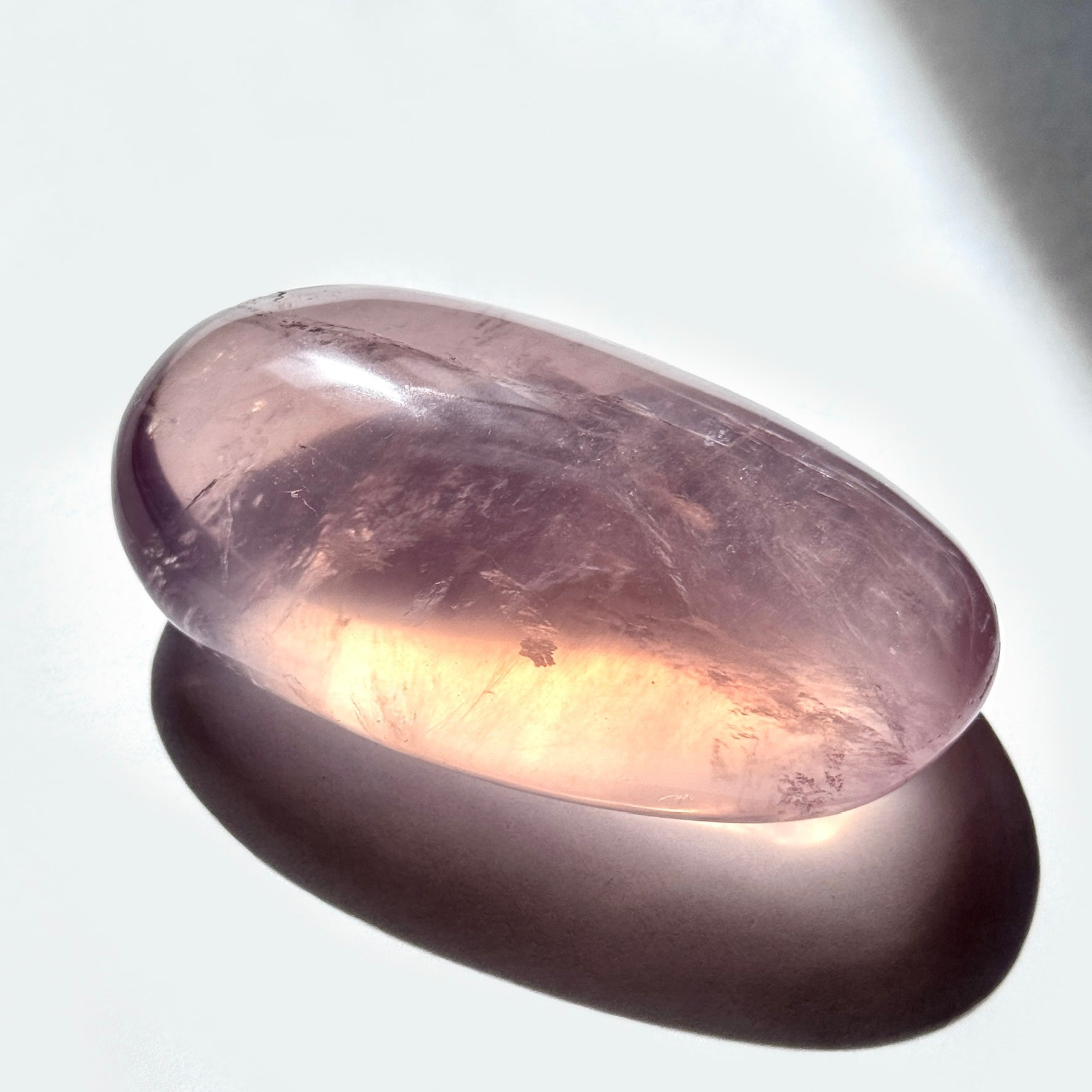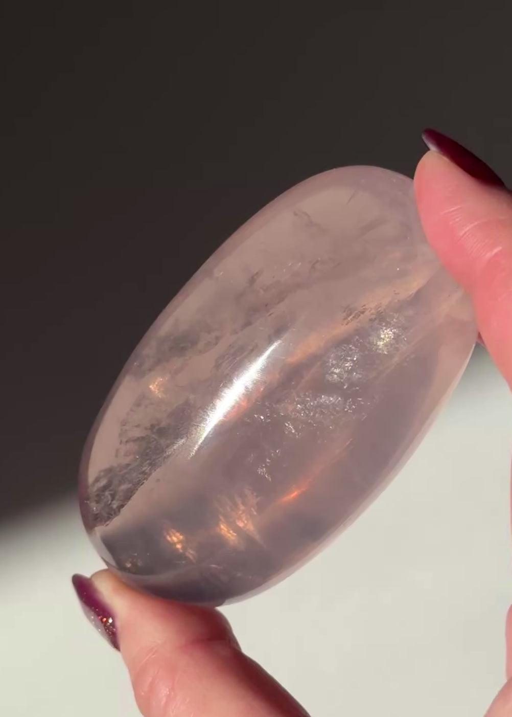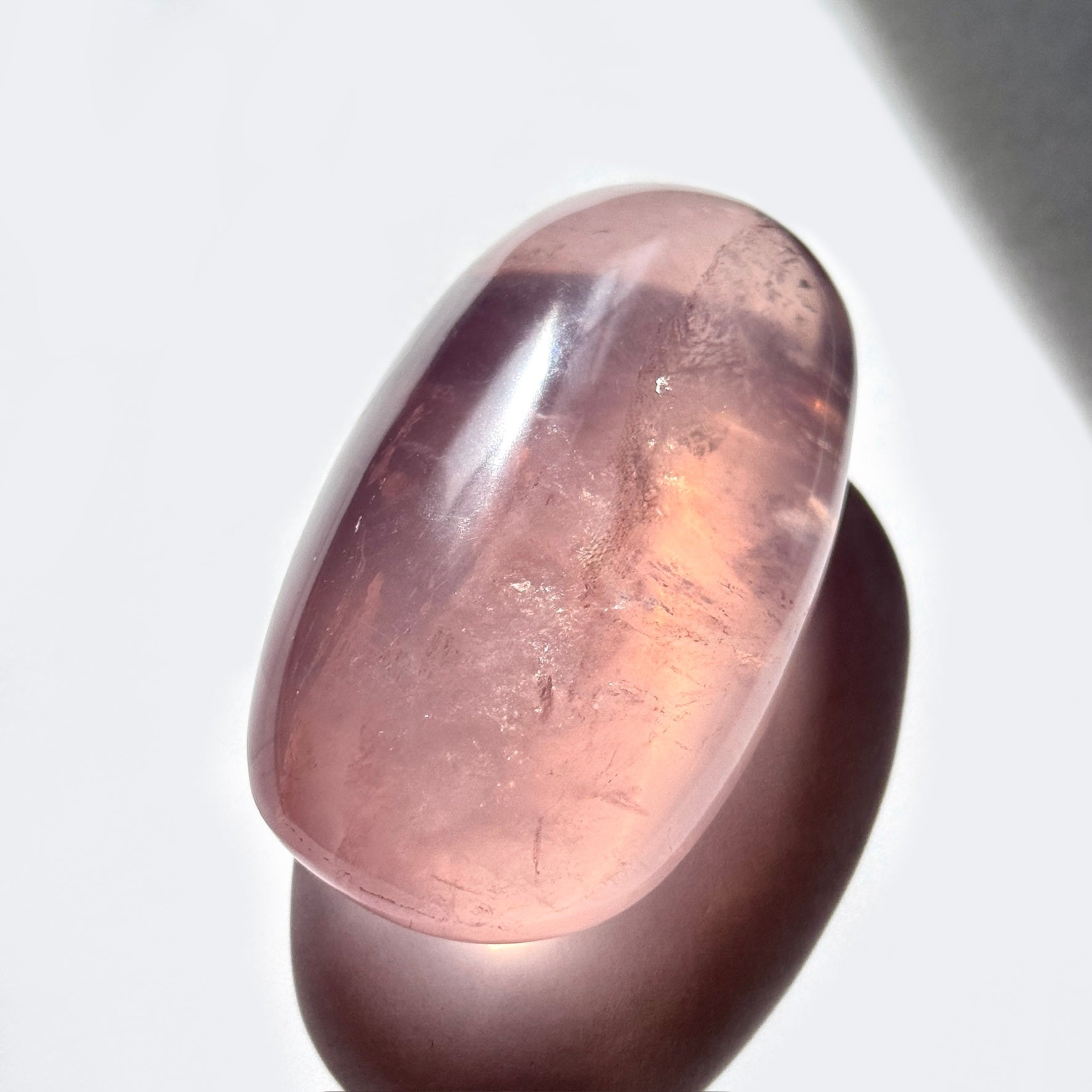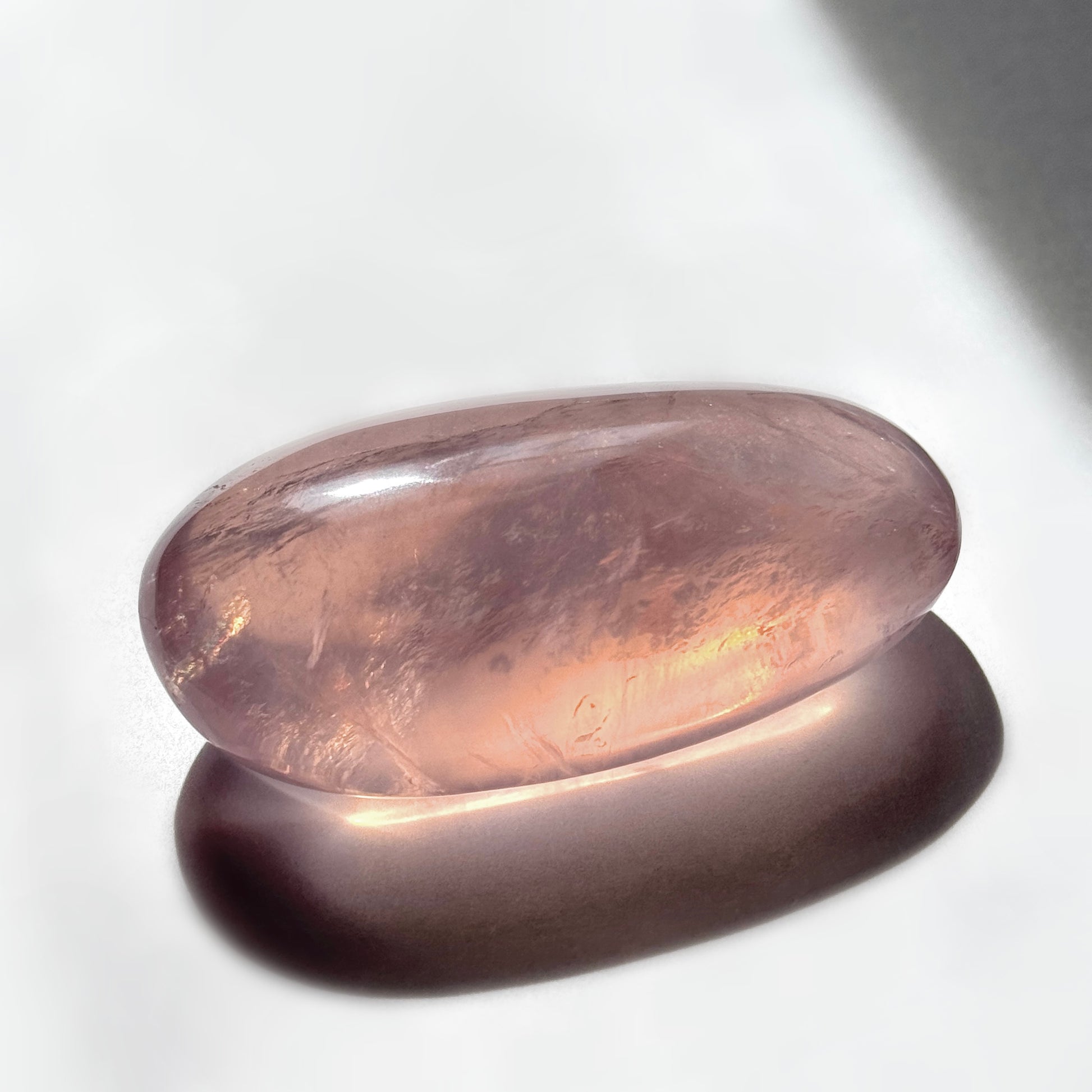 パッと見はクリアなローズクォーツですが、光に当たるとオレンジ色に発光します。