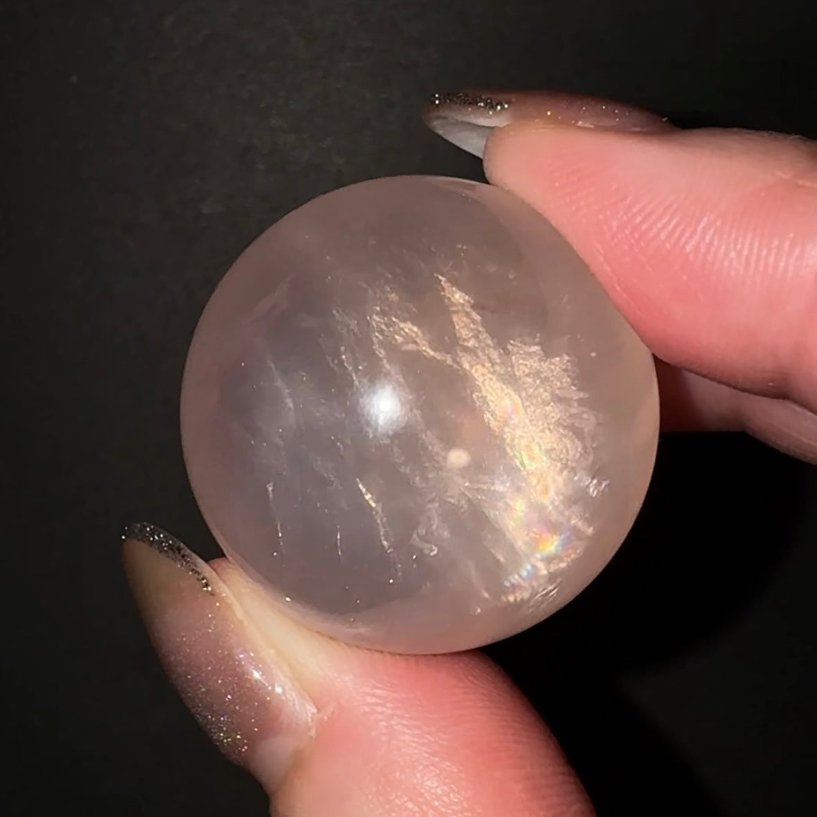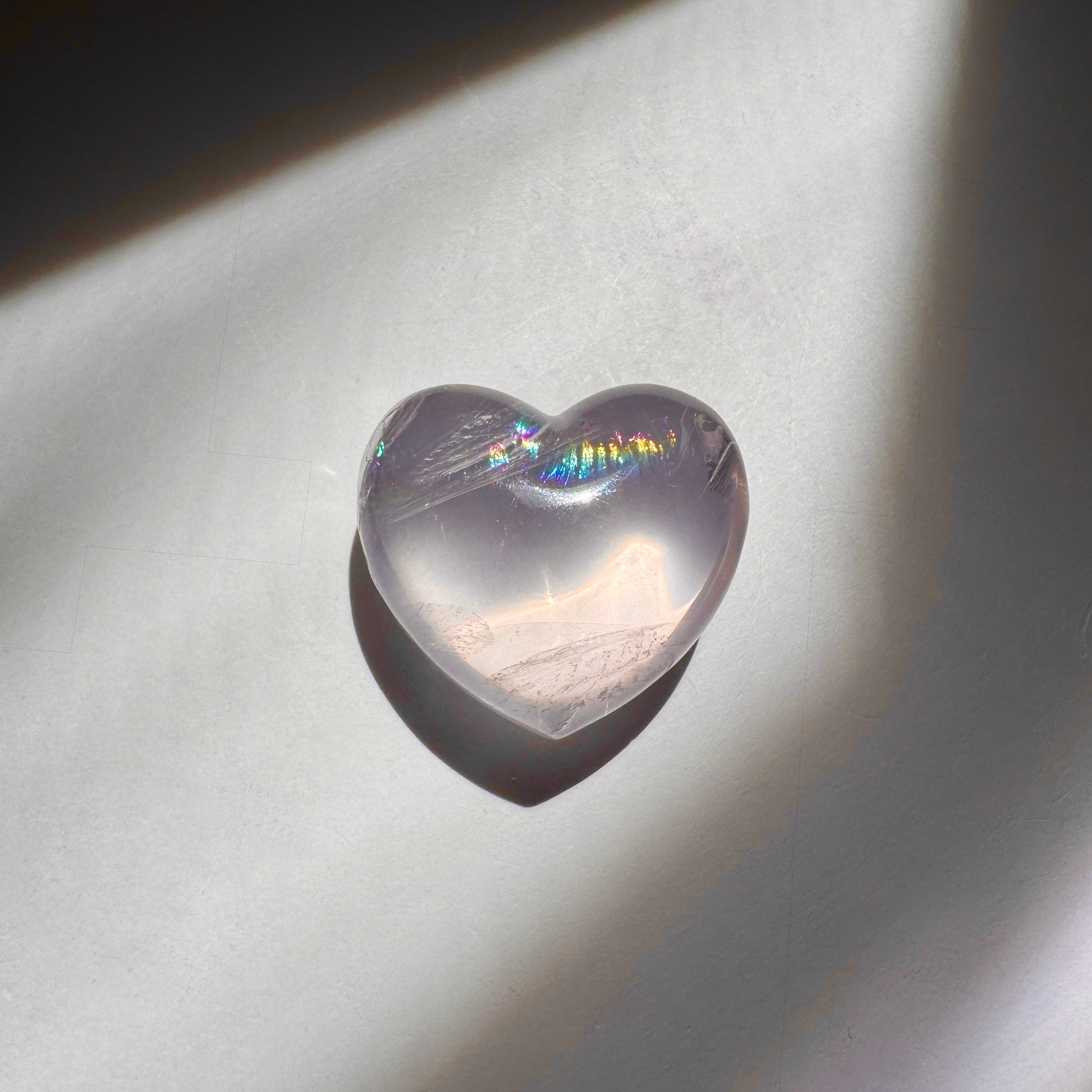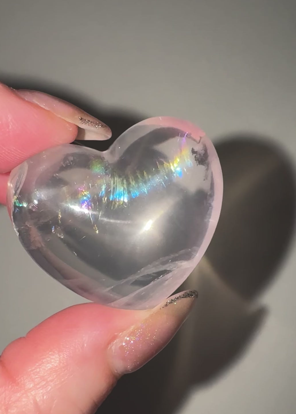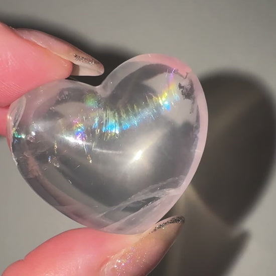 虹入りのぷるぷるハートに、星座のようなルチルがキラキラするスフィア、フローライトはピンクとクリアの2トーンに、銀色に光る雲母がついています。