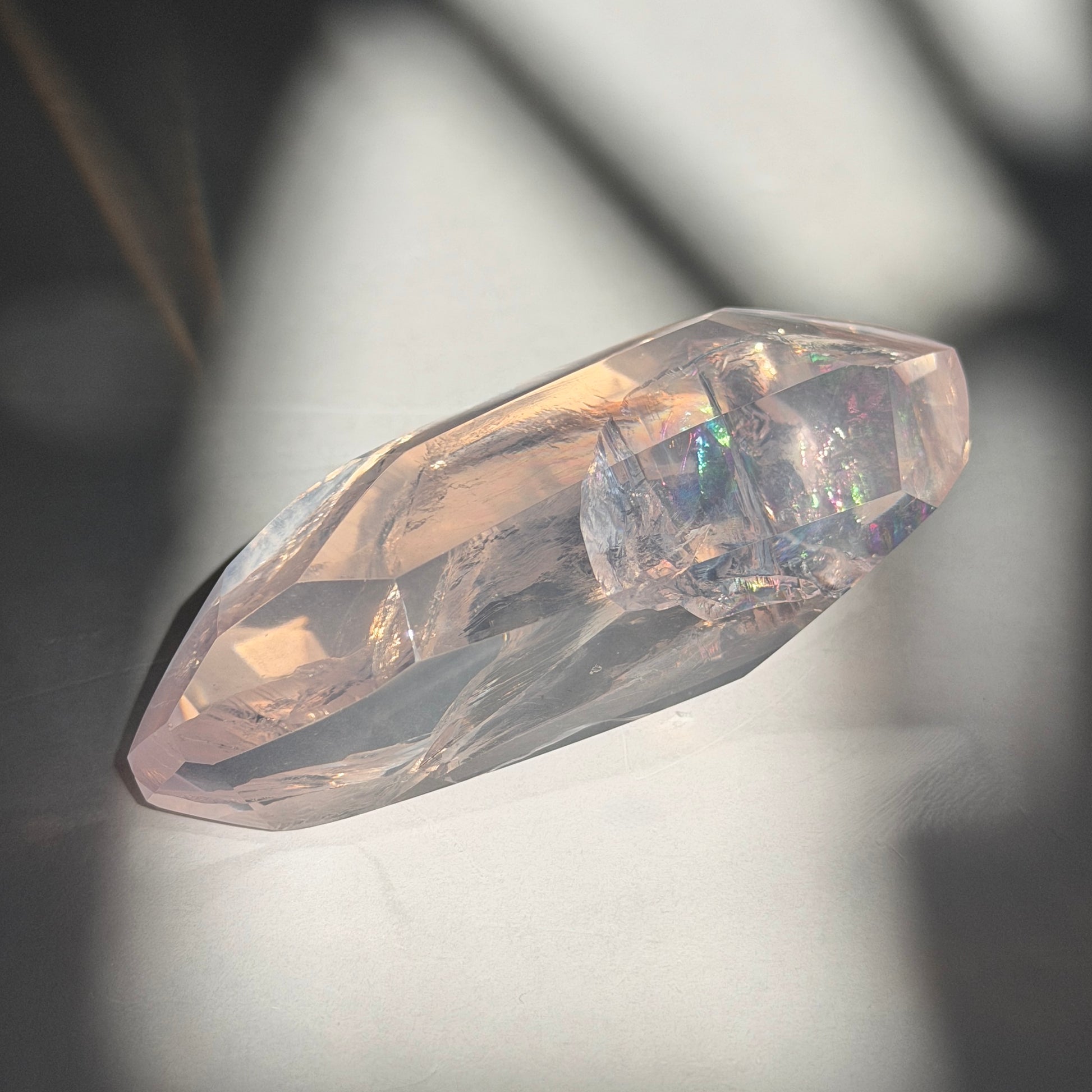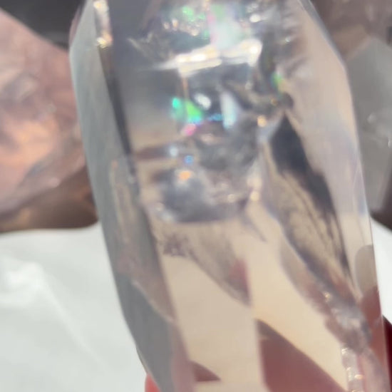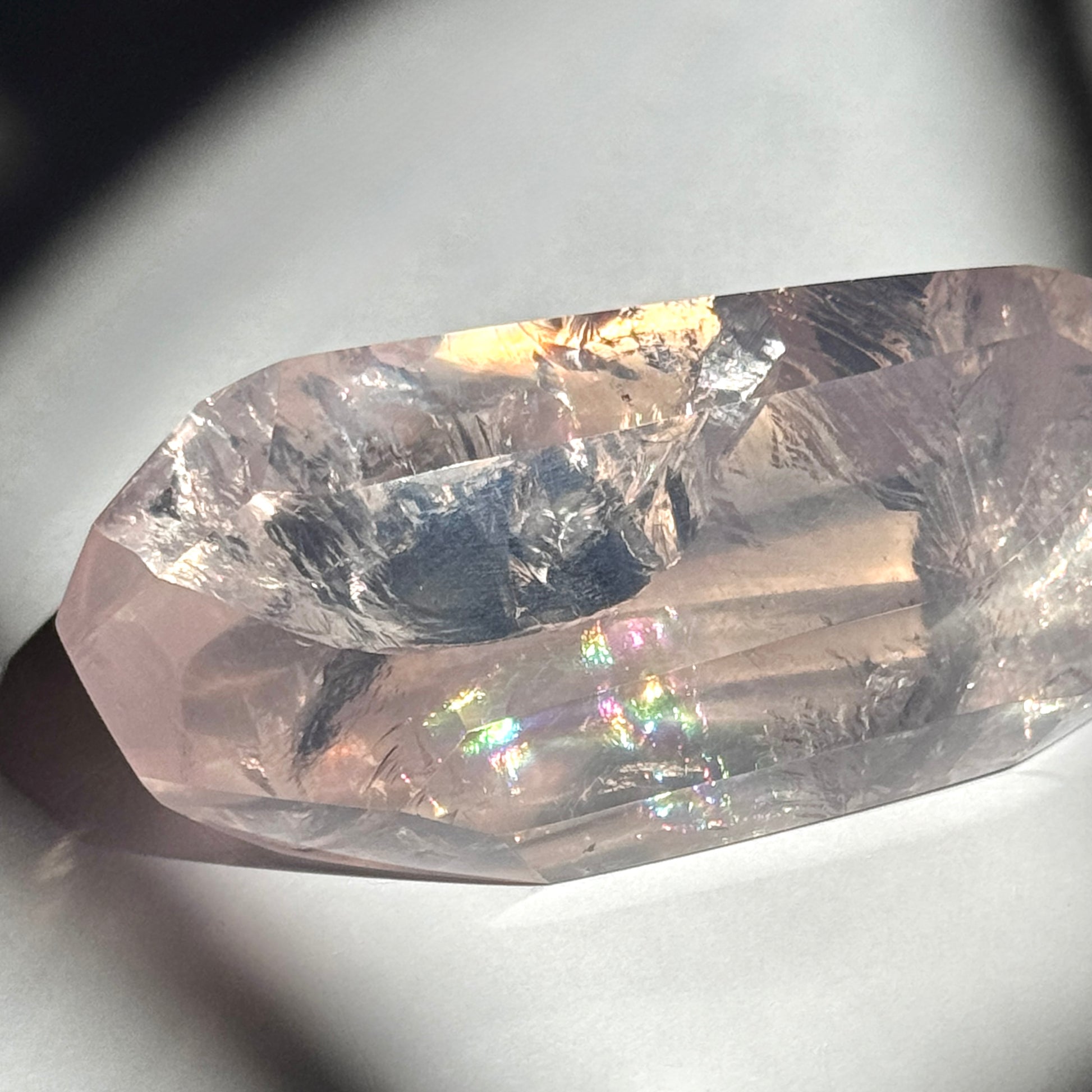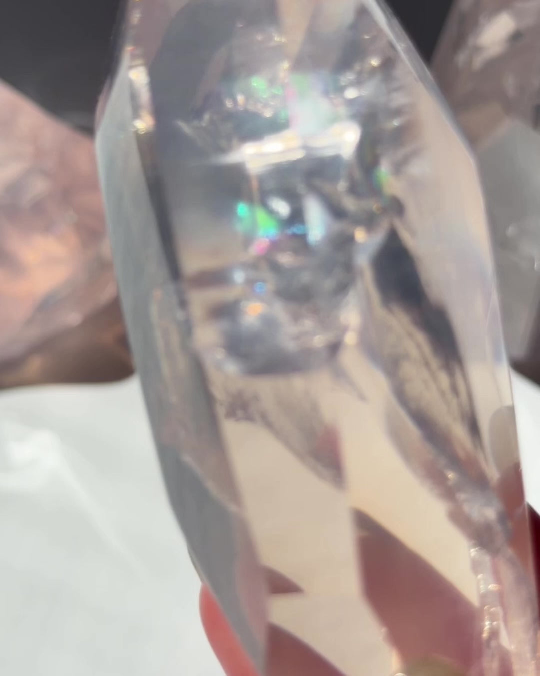 透明感抜群のピンク色に大きな虹がたくさん入り、角度によってルチルの青白い光も現れます。