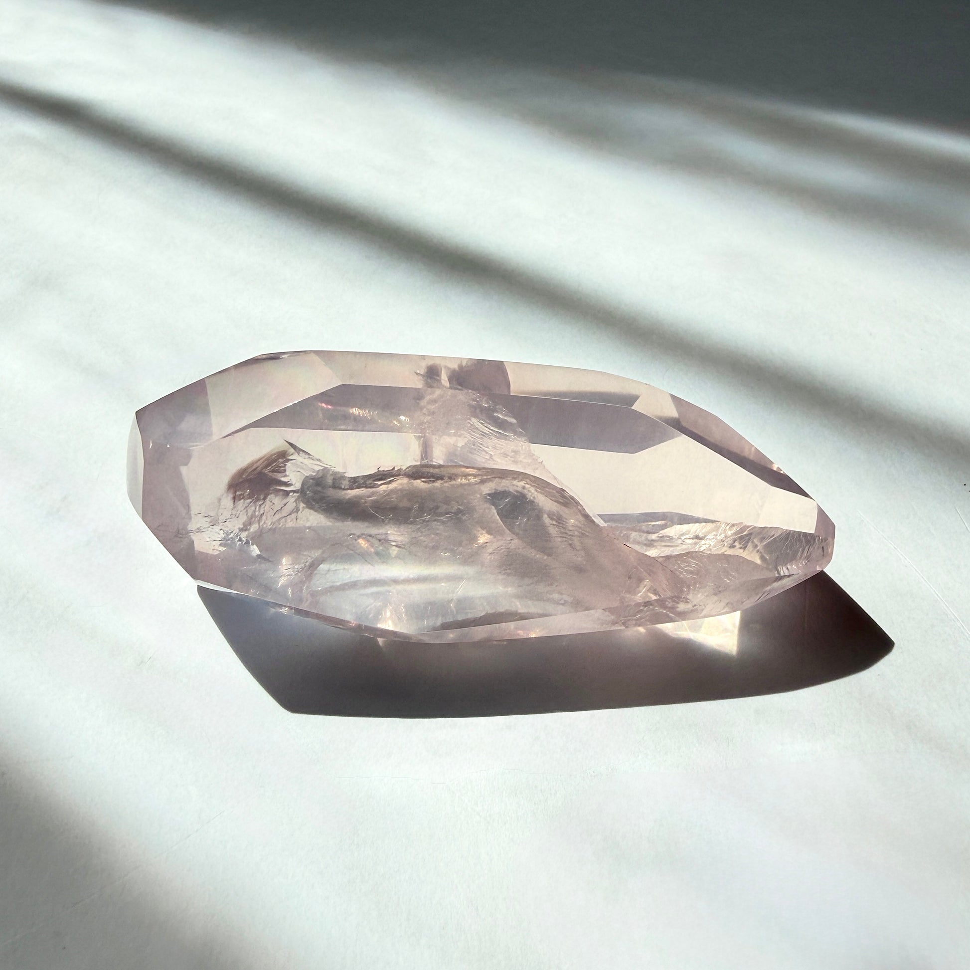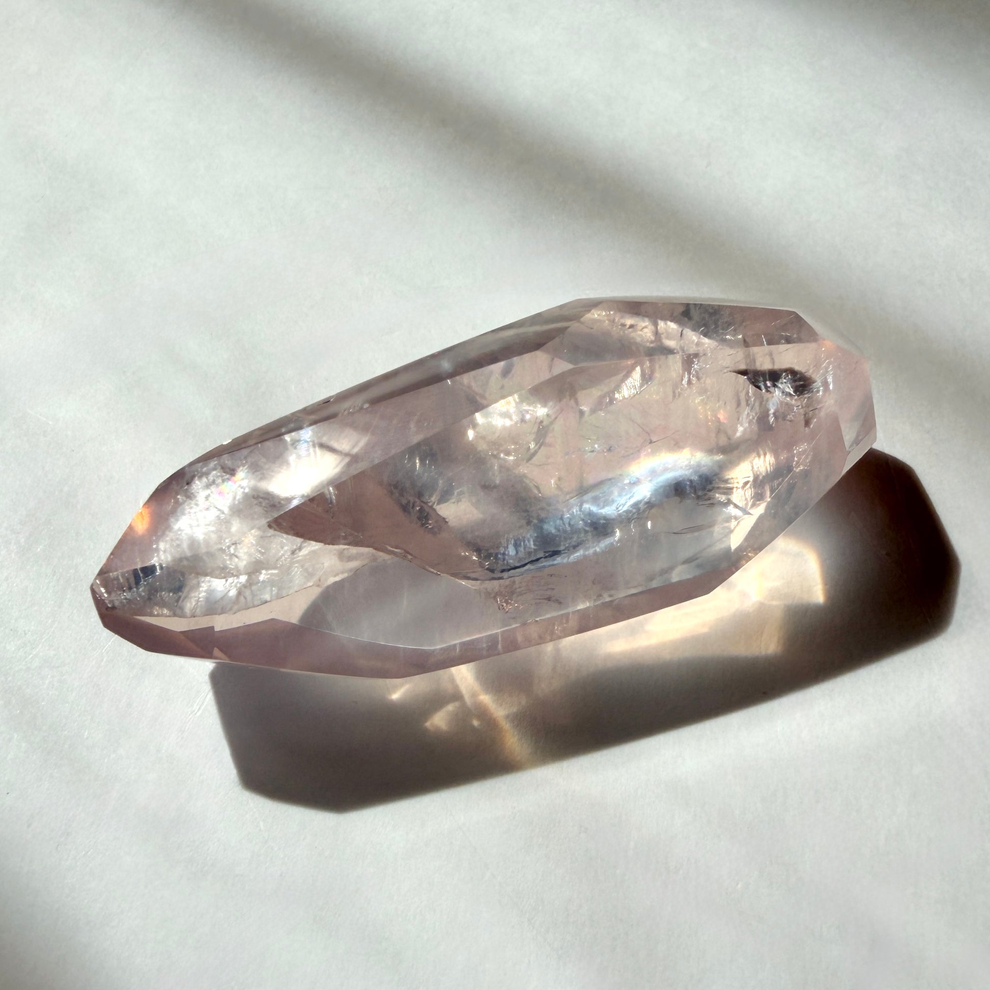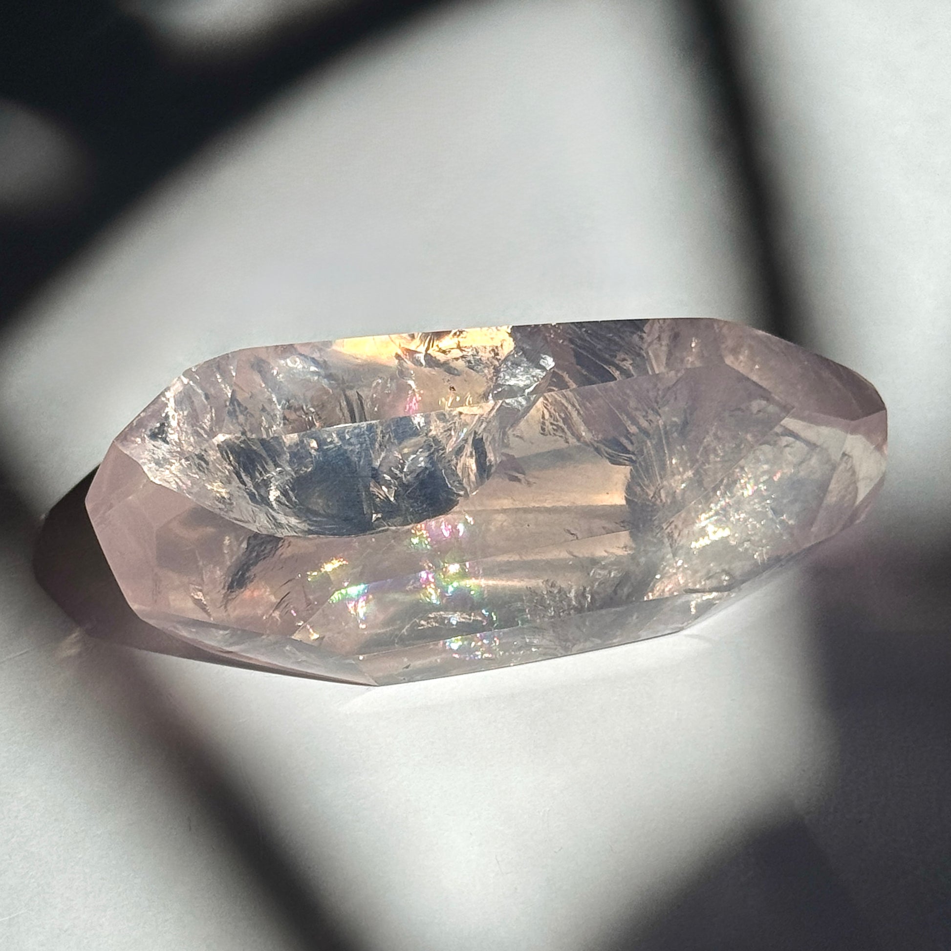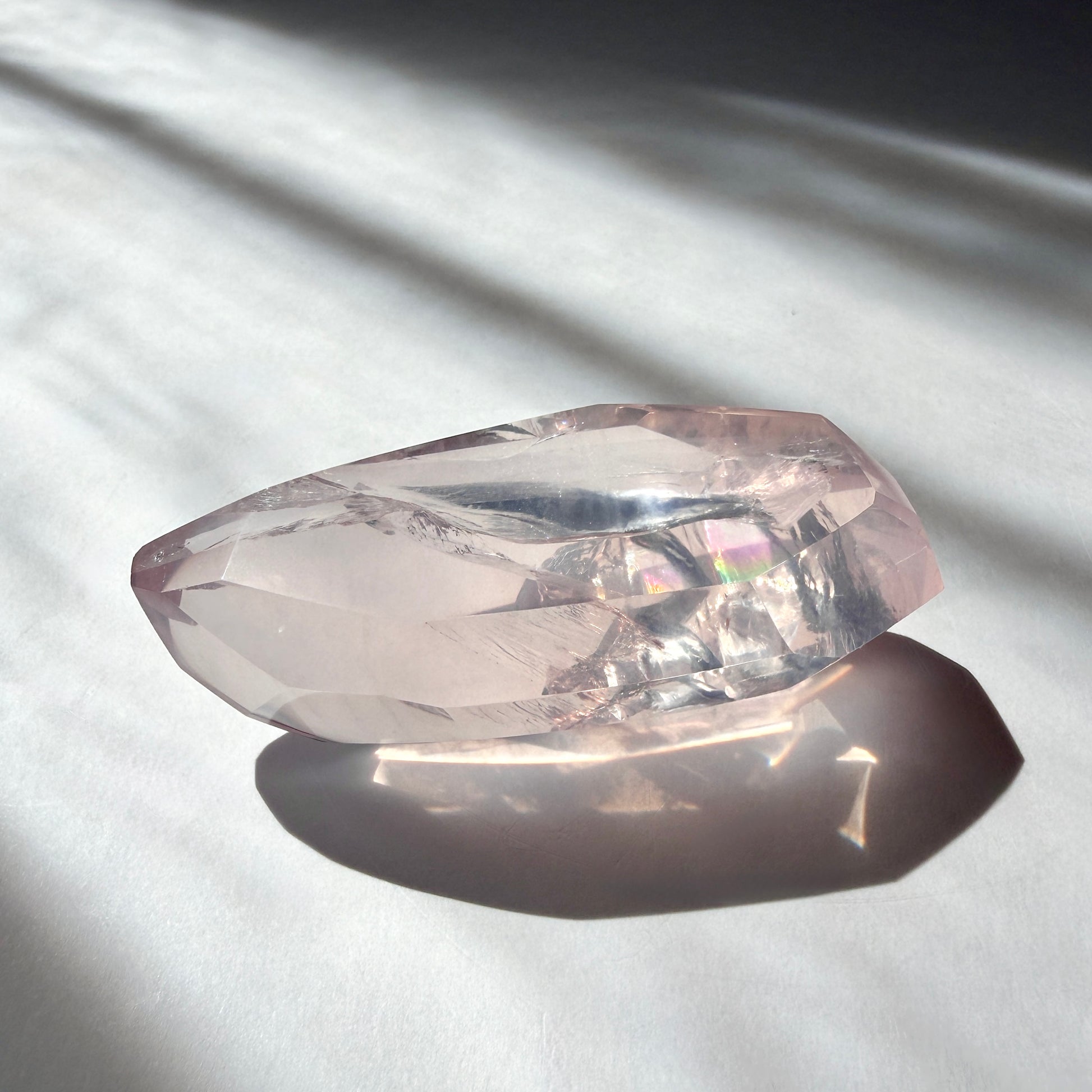 透明感抜群のピンク色に大きな虹がたくさん入り、角度によってルチルの青白い光も現れます。
