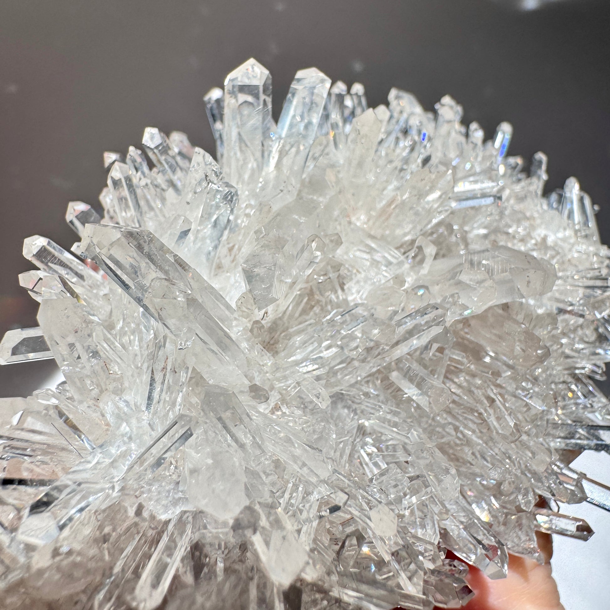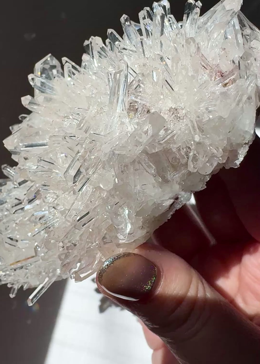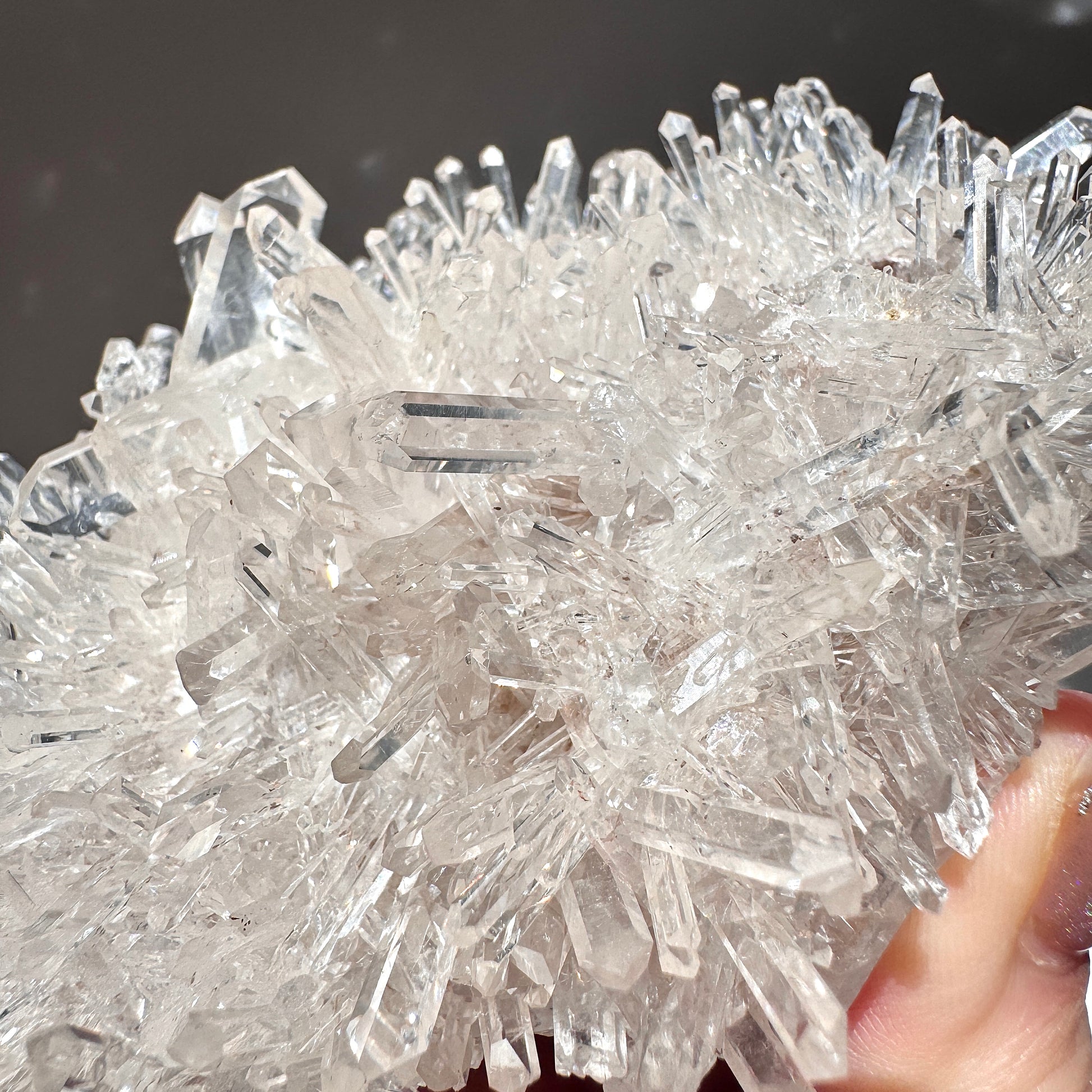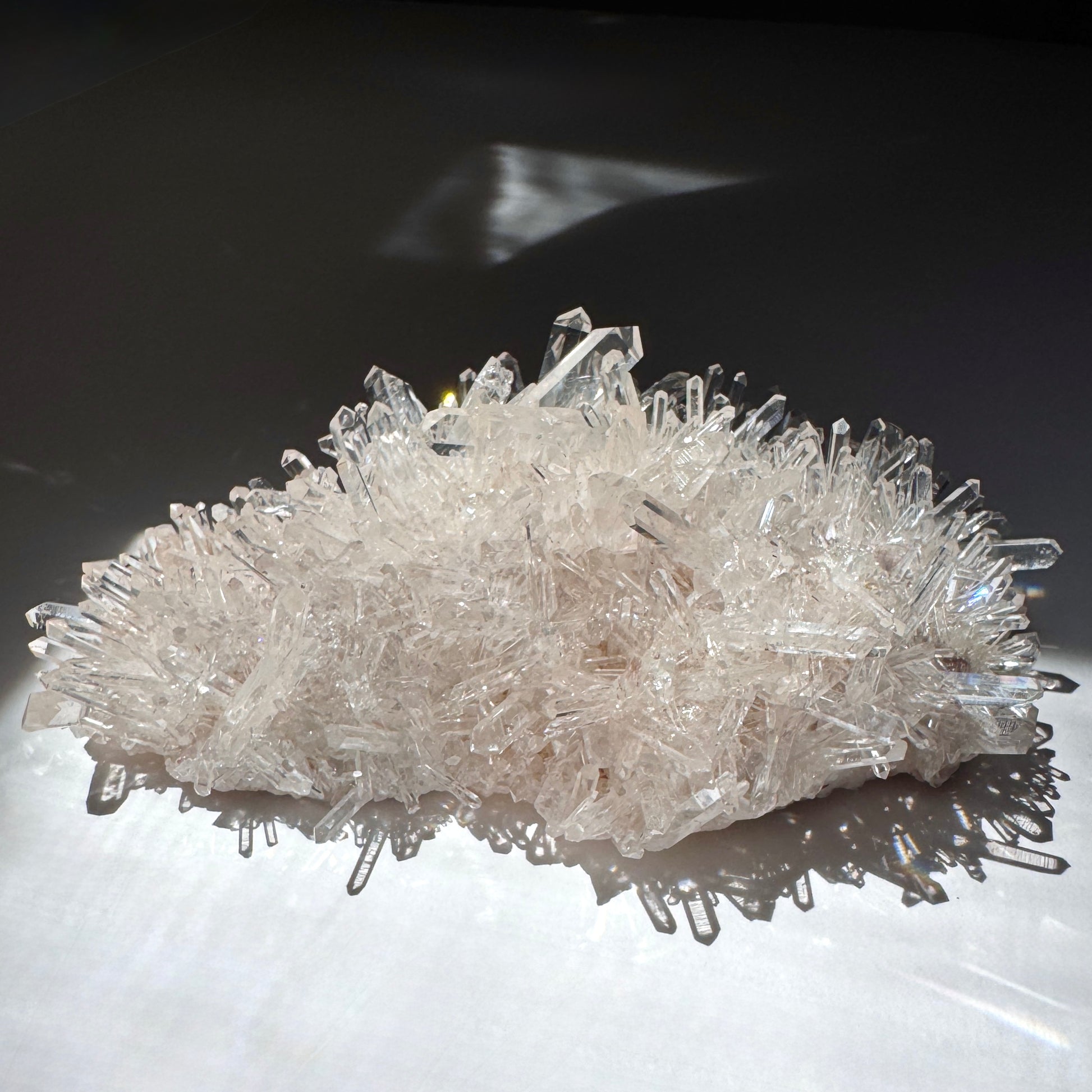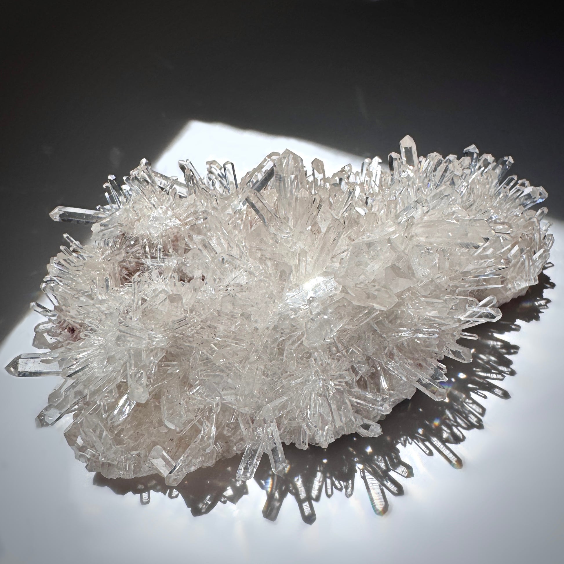 長い結晶自体はほぼカラーレスですが、目に見えないくらい微細なブルースモークの効果か、輝きに艶っぽさがあります。