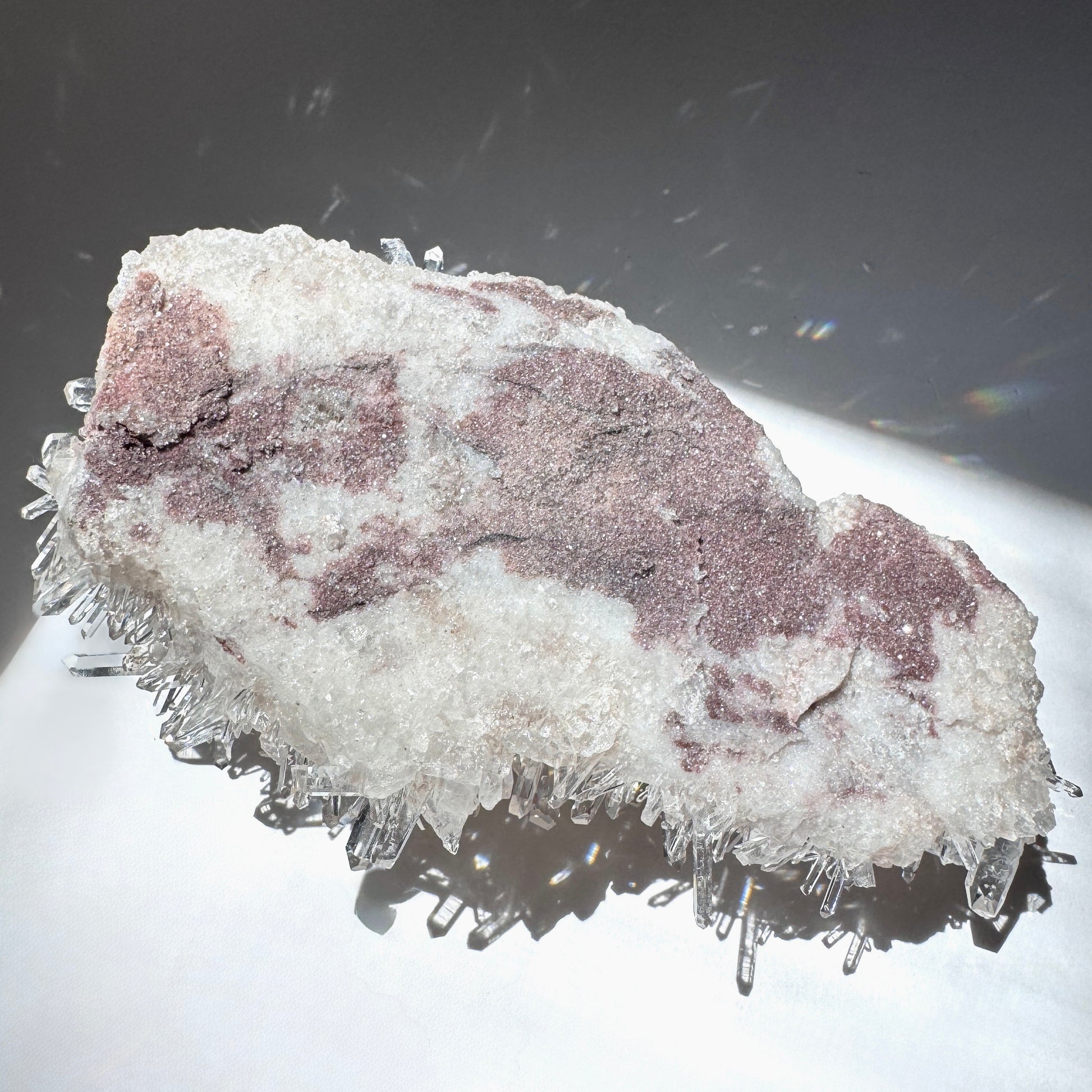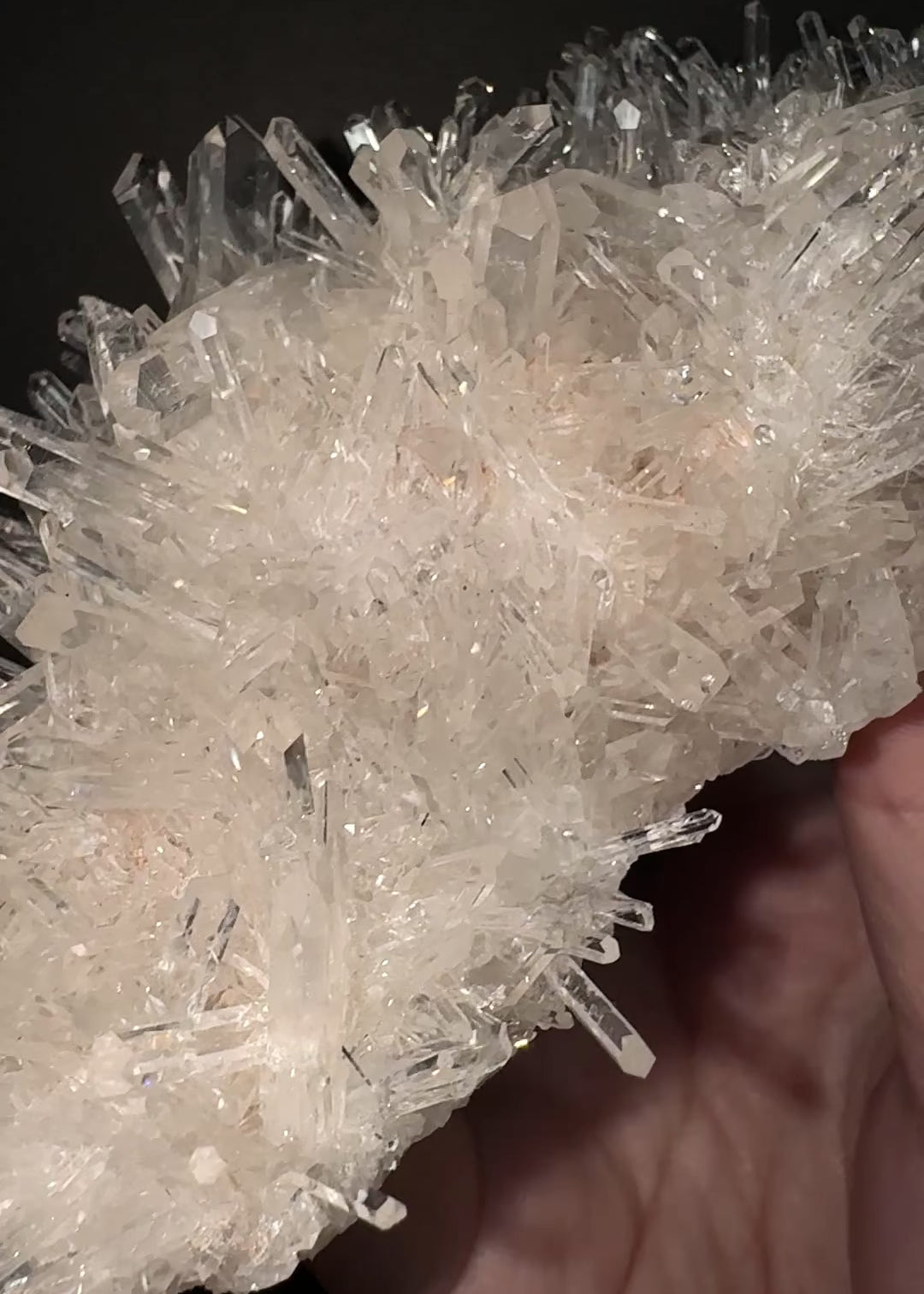 みずみずしいウォータークリアの結晶でびっしり埋め尽くされていて、所々隙間からベースのピンク色が透けて見えています。